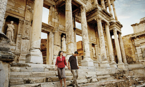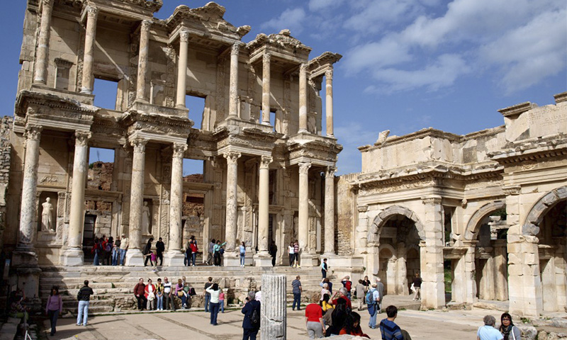 Wir nähern uns den Ruinen der legendären Stadt Ephesus. Erst gehen wir durch die arkadische Strasse und besuchen das imposante Theater das eine Kapazität von 25.000 Zuschauer hatte und das größte seiner Zeit war. Dann kommen wir vom Gymnasium und der kommerziellen Agora vorbei und schauen uns die berühmte Celsius-Bibliothek an, deren Rekonstruktion es uns ermöglicht, ihre Bedeutung in der Antike zu schätzen. Hadrians Tor, die