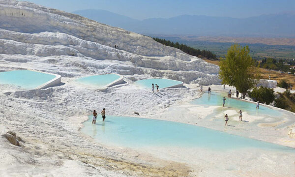 Por la mañana salida de Pamukkale, llegada al mediodía a Éfeso y por la tarde a Kuşadası. Después del desayuno salida del hotel para visitar  Pamukkale , significa  Castillo de Algodón. La naturaleza convertida en hábil arquitecto, sobre un acantilado fluvial de ciento sesenta metros de altitud, eleva este grandioso decorado surrealista, que es peculiar en el mundo entero. A parte de visitar las terrazas de calcio y piscinas de las cataratas petrificadas, visitaremosla  Necrópolis de Hierápolis , más grande del Mundo Romano. Ciudad de Hierápolis, donde fue martirizado San Felipe, es la  ciudad de vacaciones más popular de los ricos romanos, gracias a sus termales, donde  vinieron a pasar sus días de jubilación. Pamukkale es conocido internacionalmente por sus fuentes termales. Desde época antigua, millares de personas han peregrinado hasta estas fuentes, de una belleza increíble, en busca de remedios para sus enfermedades.